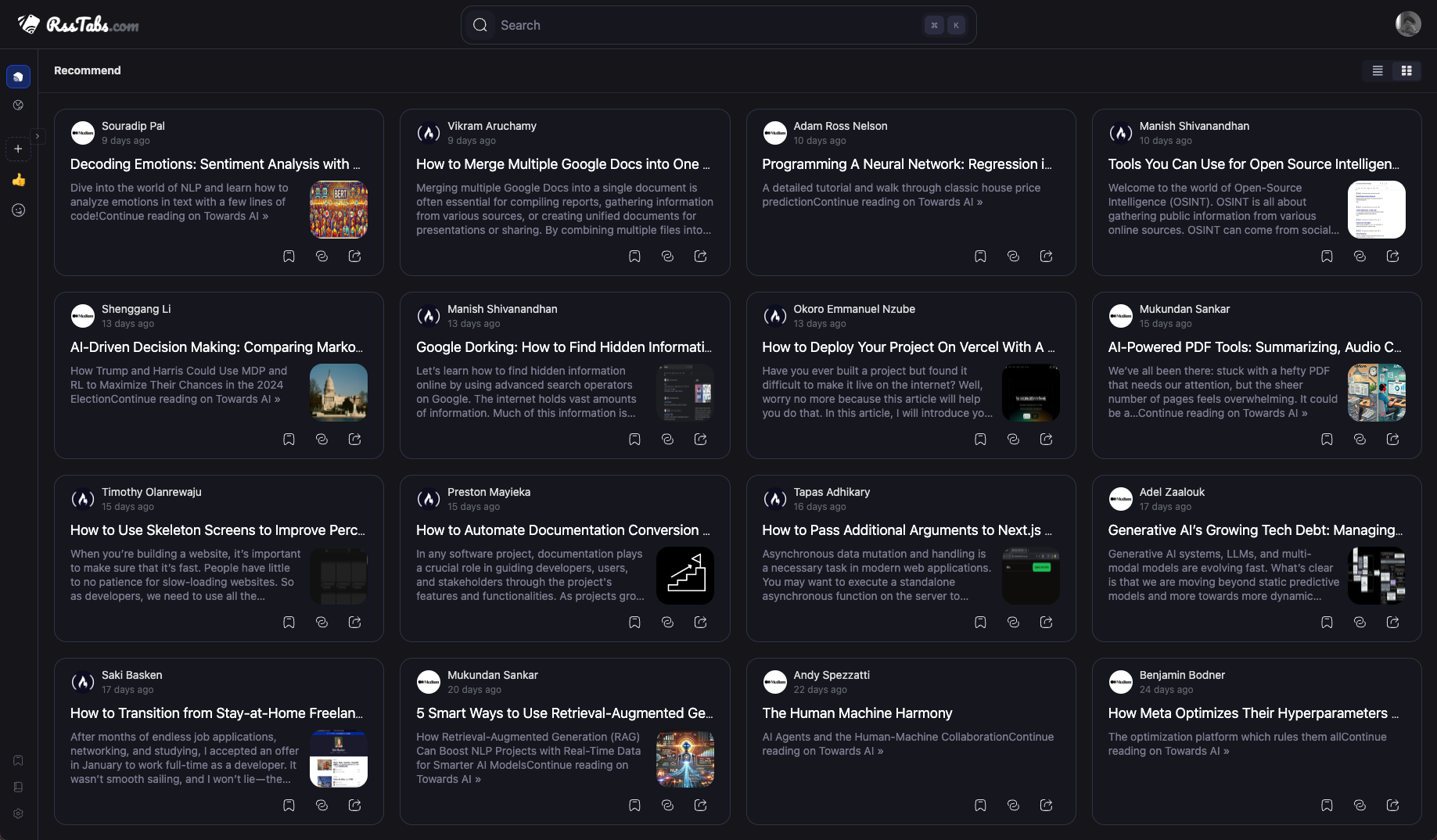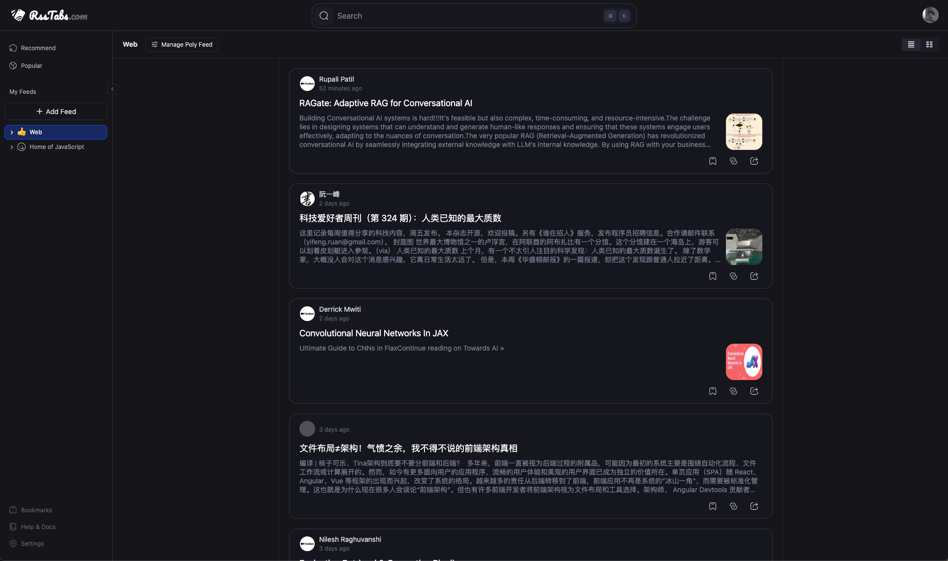 RssTabs supports multi-source aggregation, which we call polyfeed. You can freely add and manage multiple RSS sources to create your own information stream with AI personalized customization.